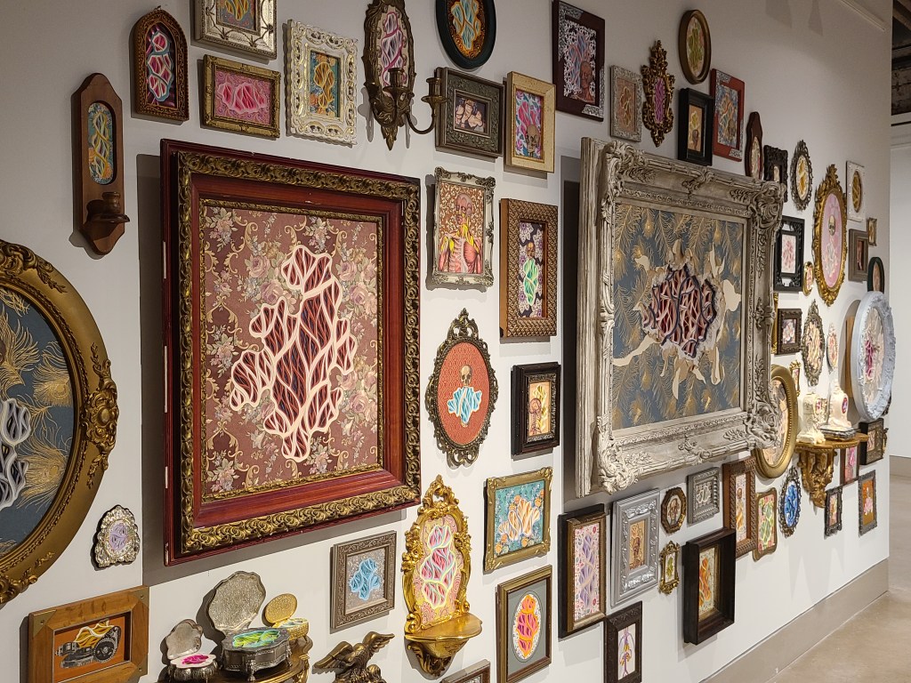 ” I find inspiration in the strangest of places. As a child I really wanted to become a microbiologist but after being subjected to movies like Andromeda Strain and Outbreak I moved on. That imagery stuck with me though. The complexity of viral and bacterial colonies, mold, mildew, necrotic flesh eating diseases, anything of the sort really resonated with me. I also find inspiration in fungi, computer generated sound waves, and topographical land formations. I also find a lot of inspiration in the practical effects of horror films. i guess you can say I love macabre imagery. Any kind of mourning jewelry or mementos are also inspiration and have a direct correlation to my frame installation work. Music, any genre metal, symphonic, rockabilly, 90s alternative, is a big inspiration as well and informs a lot of the shapes i use in the work.”
