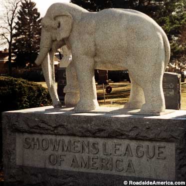 The Showmen’s League of America brought a section of the cemetery earlier in the year and named it “Showmen Rest’. That section has a very distinctive feature. It has five elephants surrounding that area. The elephant’s trunk is down and is in a position of some kind of performance act.