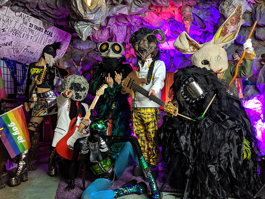 “Do you want the real answer or the fun answer? The fun answer is that we are a hybrid rock band/performance art troupe comprised of ten monsters, witches, robots and subhumans. We come from underground Altar City, the weirdest town in the west, and perform in cabaret-style settings mixing music, improvisational jams, comedy and multi-media magic.