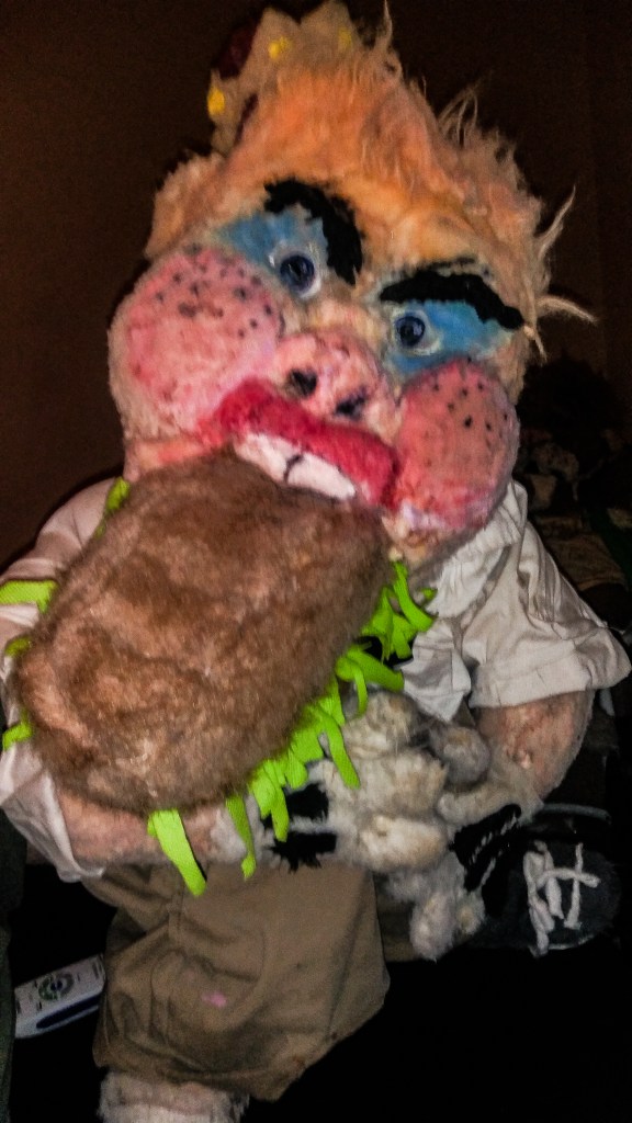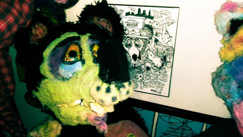 There is Rickety Rat a true fan favorite. The paranoid, bipolar conspiracy slinging, rat and his cryptic slogan VOTE RICKETY RAT. I designed him the day Disney announced they were buying Fox (Man that makes me angry) I was doing a lot of cardboard art at that time, so I’m at the old job getting angry that another conglomerate is growing bigger so I’m just thinking Mickey with a bullet in his brain. I come home, draw that up, cut it out and think wow, that’d be a sick puppet. I hadn’t made a puppet in years and at that point was actually back on Ventriloquism. Something took over and the rat was born