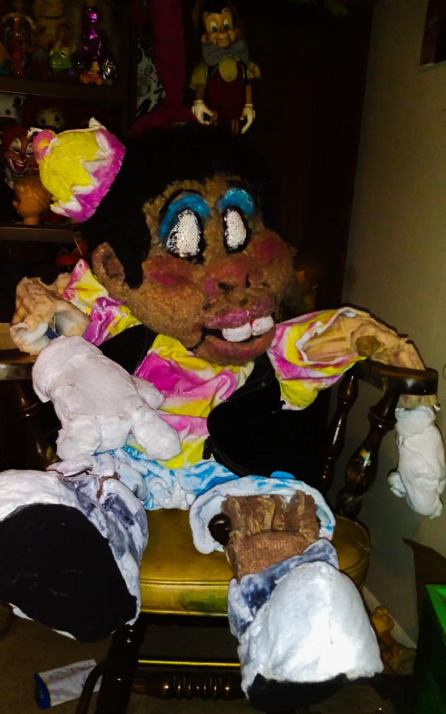 Finally my newest creation is Petey The Puppet. Petey is a marionette who cut his own strings so no one could Last year was rather crazy, I had a mental breakdown and the beginning of that I attended and participated in a black puppetry festival at UCONN. At this festival we learned that the first true original American puppets were blackface minstrels. Fun fact, I’ve been studying blackface since I was 9, and had dealt with seeing blackface puppets my whole puppeteering life and they had been dealt with in a very shitty way “it was history” I ended up rabbit holing into blackface and even wrote a full very intense play. So a year goes that I’m working on by now I need healing and relief because this year is fucking NUTS already. I really start to think about black puppets again, and how few there really truly are. Then I think of all the black children back in the day and how they couldn’t see themselves in shows like Howdy Doody and other puppets on TV. Then I start to what black puppets did I actually see on TV myself? I came up with Cousin Skeeter and Leon from The Puzzle Place (also Clifford from Muppets Tonight) I also remembered the multiple hours I would spend on the internet looking for a black puppet of my own and not finding a single one I liked. Enter Petey, a huge wave pf relief from this long struggle of identity within the puppet world and myself I felt like a kid all over again when he was done, I’m really looking forward to his future.”