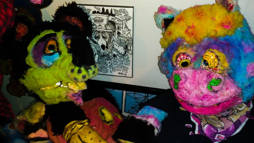 “The Underground World? The Underground World is The Nate Puppets extended universe! This is where all my puppets coexist even of they are not aware of it. There’s the two cities (at the moment) There’s ClEVE-Land where Rickety and Company live and theirs Rauppetsburg where The Slack Pack live (my Ventriloquist dummies) I could never truly give them up so I gave them territory. There is also the holy council which Lion actually sits on. The world itself exist both within the puppets and my cartoon work. CLEVE-Land is like the city of Cleveland on 100, a super fast bright colorful never ending landscape of chaos and silliness. The Current residents are Rickety Rat, Winkleperry, Peanut Butta an Elephant pinup and superstar, Odd Cat a singing Alley Cat, Chester Cheese a large corporate figure head , King Danny a monstrous murderous circus gorilla, Hoggie a Miss Piggy, Divinesque madame, Tubby, DJ Octoid an octopus DJ, and Petey The Puppet .