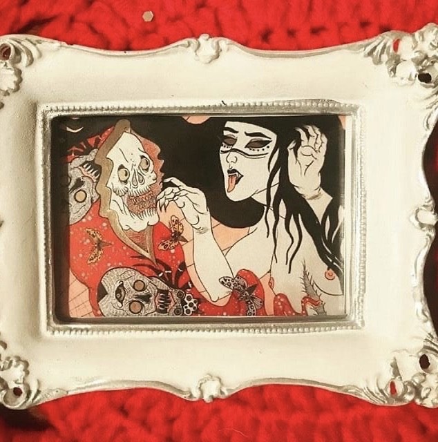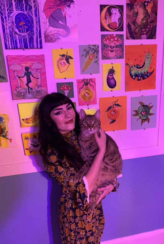 I’m a double Scorpio and a triple psycho (j/k hehe). I am an Illustrator living in the woods of rural Pennsylvania, with my tiny fur family and supportive partner. Although my main focus is art, I work part time at a Crystal shop in an antique mall- which can be quite fun and often provides some otherworldly and visual inspiration. My work is greatly influenced by Japanese Ghost Scrolls, Horror Manga, 60’s/70’s Italian Horror, sweet lil vintage Halloween Décor and of course nature.