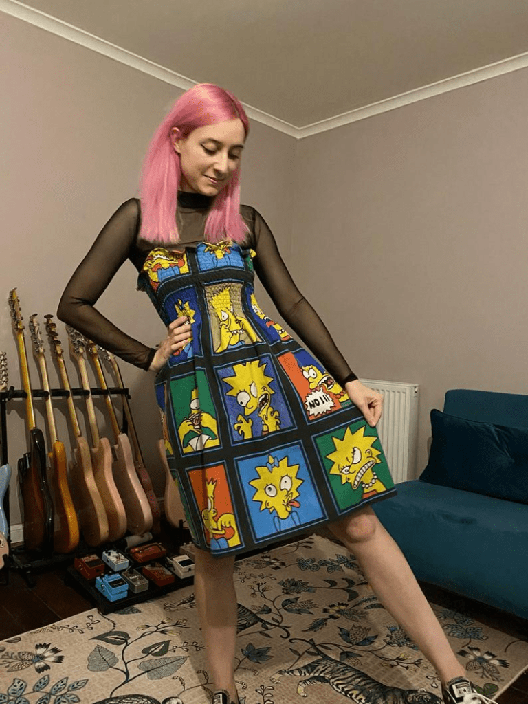 “I’ve always wanted some lovely Simpsons clothing and when Vans came out with their Simpsons collab I was SO excited (I own around 50 pairs of Vans… I wish I was joking!) but when the clothes were released and I saw the range I wasn’t overly impressed with the designs. So I took it upon myself to make myself some items that I’d love and wear. I’m vegan and very conscious of my carbon footprint as well as recycling and reusing as much as I can; I was browsing online for Simpsons items (as you do) and came across the coolest retro bedsheet. As they were made in the 90s they’re mainly made of polyester which takes hundreds of years to decompose so I thought.. win win I can save something being in a landfill for years to come and reuse it to make something I love! I then found someone on Gumtree local to me selling a whole bunch of bedding and some certains so I bought those and half of it was some amazing Simpsons items which I’ve made into bags, dresses and someone asked if I could make some pocket t-shirts so I added those too!”