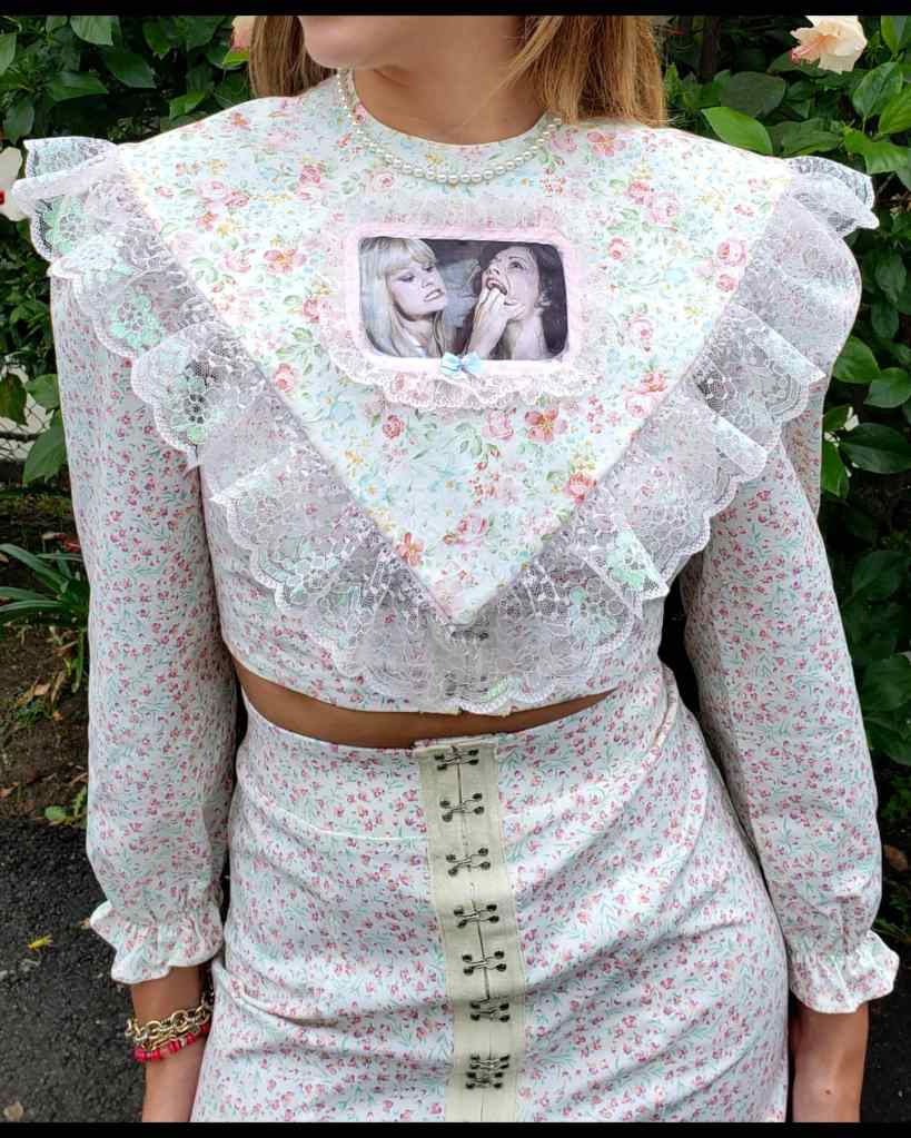 “The first piece I made was the Scary Faces Dress, it was the first fabric I found and fell in love with it and made the pattern myself and took me around 6 hours to do everything first time! A lot of trial and error went into it but I’m really proud of how it came out in the end. Making the top half elasticated was important for sizing and to ensure it fitted anyone that clothing size no matter their bust size. “