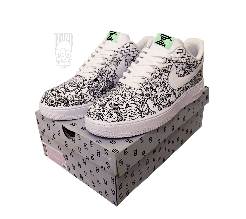 “Hello Lady Cult and readers: I’m a British artist, born and living in London to a Scottish Mum and a Welsh Dad. I’m a Dad too and would-be husband (COVID-19 19 messed up our wedding plans this year). I’ve been drawing and into art ever since I can remember and I guess I’ve been lucky to find that “thing” that makes me happy from an early age. That being said, I have not crossed over into the full time artist category. Although over the years I have successfully monetized my creativity on more than a few occasions I haven’t made it consistently enough to cover the cost of living. I’m doing my best to work towards changing that. I’m not the best at labelling my art or art style, but I guess you could call it graphic art, or illustration. I enjoy painting murals & trainers (that’s sneakers to US readers & basically everyone else around the world). For over 10 years I’ve been selling my art on footwear under the project name “T R I P L E Z E D” you can see more of that project over at triplezed.com