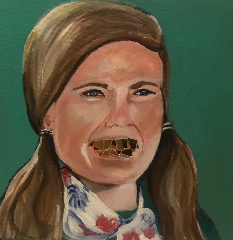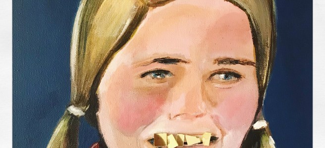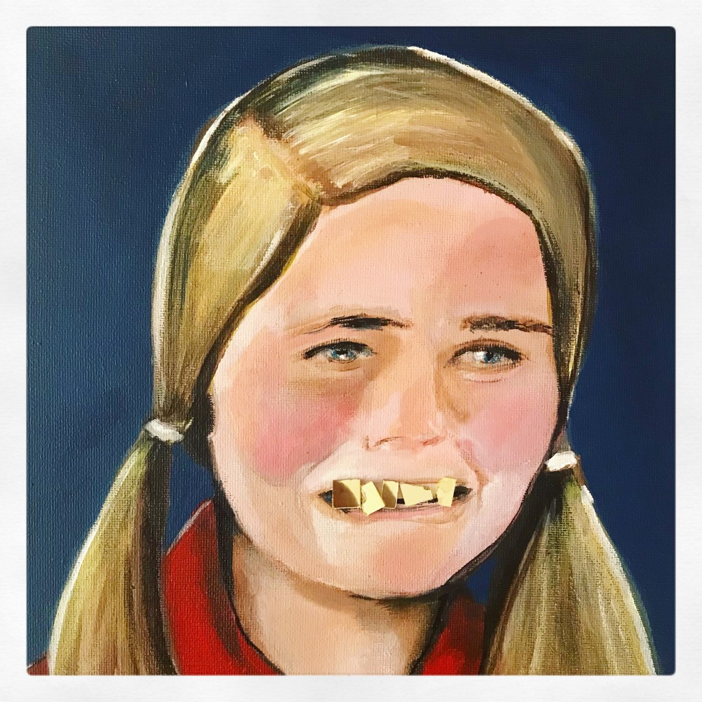 “I was reading The Artist’s Way and one of the assignments was to go to the 99 Cent Store and just buy random things. I bought some gold stickers, not really thinking anything of them. Later, I was entranced by the image of tween Marcia Brady in her braces bitching about something and knew I had to paint it. I didn’t feel like the teeth were finished (note: everyone hates painting or drawing teeth). I looked down and saw the gold teeth and said ‘There are my braces!” So, those gold stickers were my first official teeth painting. After I got the fake teeth, I turned to Marcia again – she had some teeth issues; she hated her braces, and she was in love with her dentist. I knew I wanted to paint her mouth agape, dreaming of being Mrs. Marcia Dentist.”