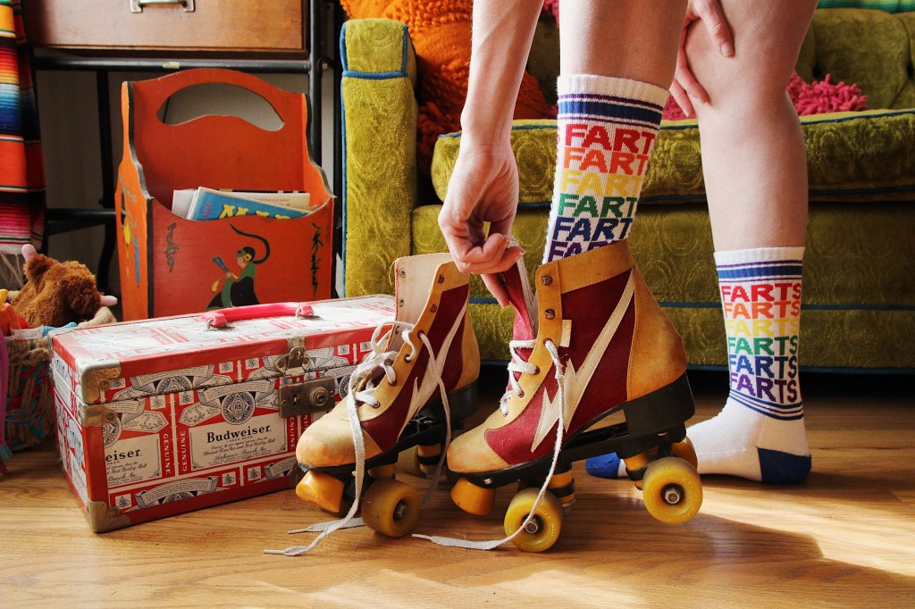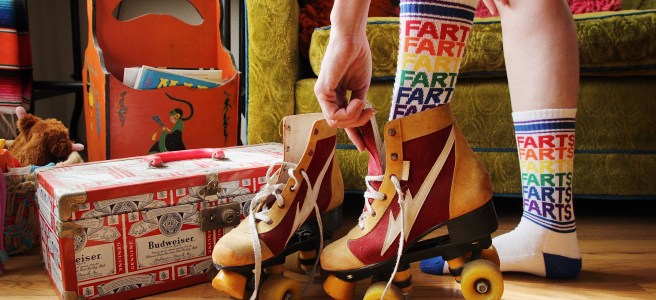 ” Gumball Poodle started on a whim, way back in 2008. I always wore knee socks and shorts – that was my look – and one day I decided I wanted knee socks that said OBAMA on them…We were all excited about the election, there were loads of t-shirts, bobbleheads, toilet paper, you name it. But as it happened, there were no socks. So I made these OBAMA knee socks, really just for me, but I had to make several thousand pairs. Luckily I had a few friends with stores that said they could sell some, and then other friends got me and my socks into the Manifest Hope Gallery during the DNC.