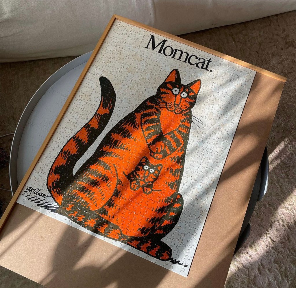 More recently, the hardest non-Le Puzz puzzle I’ve done was this B. Kliban Momcat puzzle from the 80’s. It was so hard because the focus of the puzzle is a big orange cat which has a lot of similar markings on it. It’s surrounded by a giant blank white space which leaves you with about 200 totally white pieces that all look exactly the same. This puzzle was ribbon so the pieces were relatively uniform which made it so much harder! With random cut pieces at least you have shapes to look for but in the case it’s just a matter of trying them all until you find the one that fits. Maddening!”