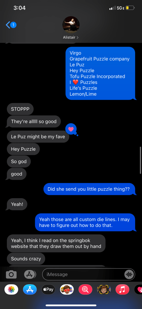 As for our name (lol!) after a lot of back and forth pitching names (of course all of Michael’s were amazing!) one of them was Le Puzz. We both loved it so much because we already always referred to puzzles as puzz’s. There’s a little puzzle within the name – if you move Le to the back in front of Puzz, it spells puzzle!! We were kind of surprised no one had taken that one yet but also I think Le Puzz in Italian is pretty close to “the stink”, which is probably why and just for the record we are 100% ok with that.”