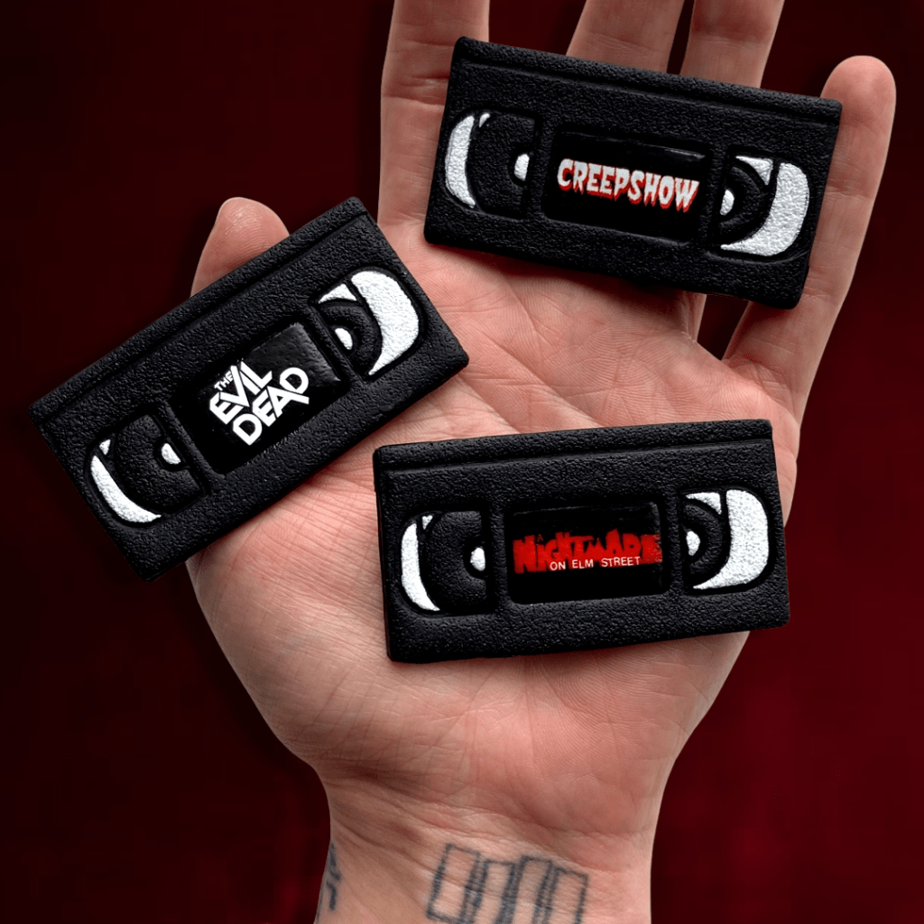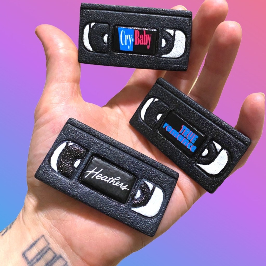 Also, on April 1st I’m releasing the “Movie Time” collection! I selected 30 Horror, Sci-Fi, and Cult Classic movie titles and turned them into miniature VHS. There will be an option for pins, magnets, and earrings. Plus an option for custom titles! I’m also making some popcorn bucket pins to go along with the tapes, because how serious are you about a movie if you don’t have popcorn?”