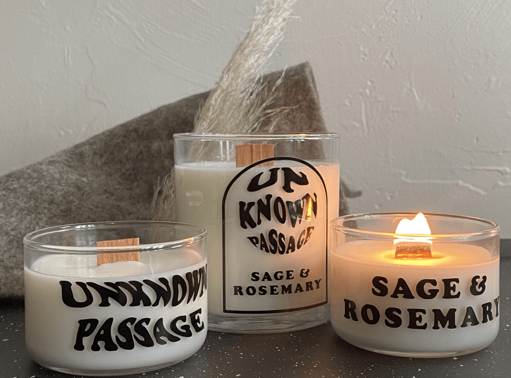 “Unknown Passage was born during a recent recovery period from carpal tunnel release surgery. I have suffered from carpal tunnel symptoms for over 15 years and was in severe pain for all of 2021. I finally had surgery in December of 2021 and while I was relieved to be on the healing side of things, I was out of my mind with boredom. I wasn’t able to work or create and so I made plans and researched how to start and grow a small business. I knew I wanted to offer phthalate-free candles made with soy wax. Many candle brands give me headaches and when I started doing research, all signs pointed to scents loaded with phthalates. I won’t try to explain what phthalates are, I’ll just say they’re bad news. I wanted to offer candles that were medium to heavily loaded with scent, but wouldn’t be harmful to my customers, their children, or their pets. I’m happy with the outcome and I can now burn multiple candles at once with no headaches and feel confident calling my candles headache-free.