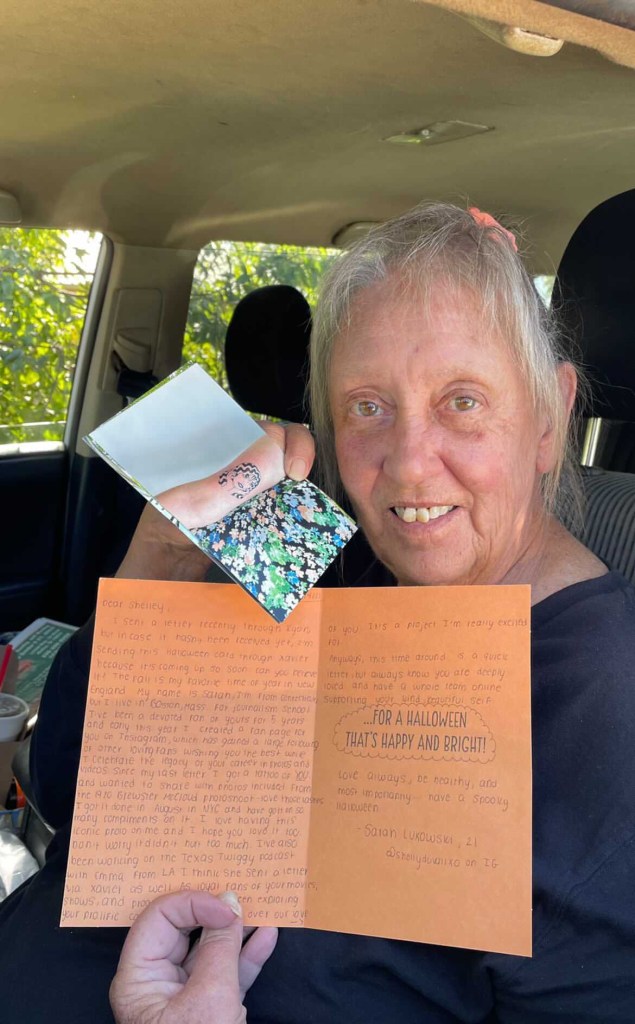 Shelley with a letter I sent and a photo of my tattoo, October 2021