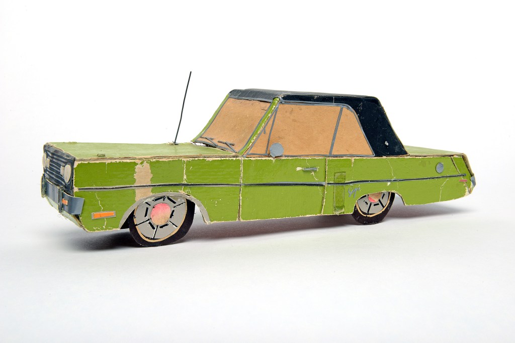 And one day to work through my horrible phobia of driving I started to make one of the first cars in my life that had significance. This green dodge. I always made collages but started to use the materials in the boxes at my feet. It was the first time I cut these treasures up. Yes they were just old packages, instruction booklets or tax records but I thought they were beautiful. It was a huge leap to chop them apart. But as I finished the car I realized it was better use of the materials then just having them stored under my desk or nailed to a wall.
