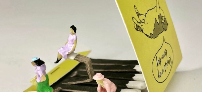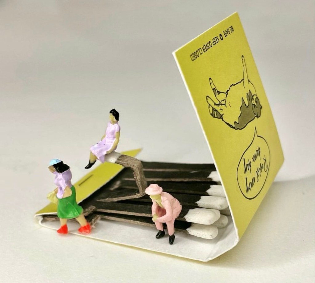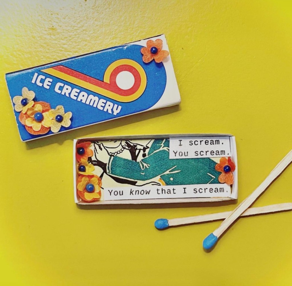 “Whatever I’m thinking or feeling ends up in my art. Through my work I can give those thoughts, feelings, and memories a safe little place to live. I don’t have to process them or figure anything out; they can just be. So sometimes my sexual self or frustrations find their way into a matchbook or two…or three. Besides, I think it’s fun and cheeky.