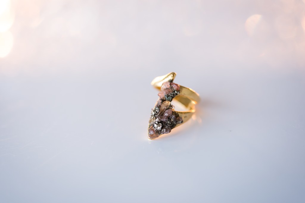 “This gold plated adjustable ring makes a perfect gift for giving this Valentine’s Day. Don’t know her ring size? No problem! The band is adjustable to accommodate any ring size 7+. The center of the ring is lovingly adorned with strawberry quartz and sparkly pyrite creating a unique combination that is both feminine and edgy.”