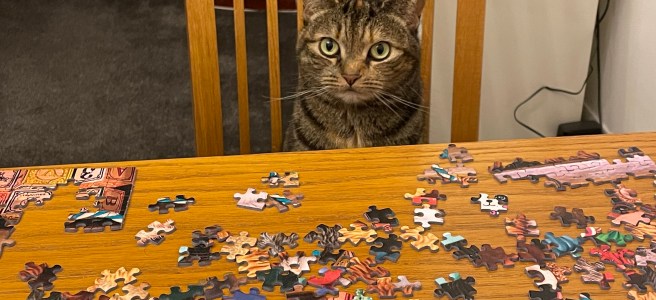Oh, this is such a hard question. I recently did a Ravensburger black ‘Krypt’ puzzle with 736 pieces. It’s all black and has a confusing cut to it (on purpose), which makes it quite hard. I can normally complete a 500 piece puzzle in under an hour (depending on a few things). So, I didn’t expect a 736 piece puzzle to take a full six days. It’s hard to say whether that makes it my recent favourite or recent least favourite. But . . . it’s left its mark.