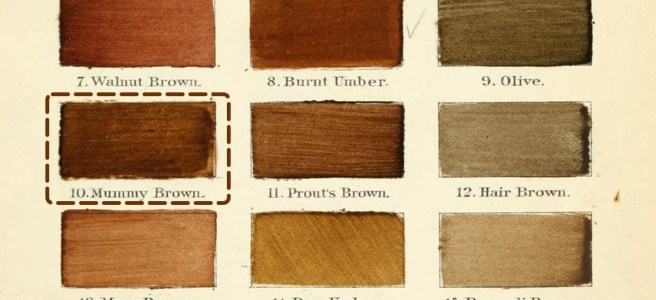 There was a dark brown color that artists commonly used called Mummy brown. It was popular in the 16th and 17th centuries and was made from a mixture of myrrh, incense, and the remains of Egyptian and Gunache (from the Canary Islands) mummies and mummified cats. Painted these centuries preferred this brown because of its significant usage of shadows, flesh tones, and shading. Unfortunately, there was such a high demand for mummy brown that Egyptian and Gunache mummies would run out and use recently dead bodies of slaves and criminals.