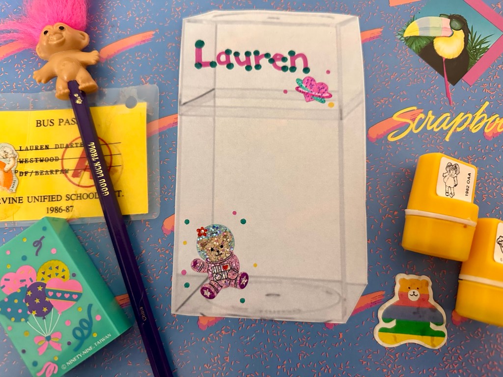 (Pic 2.“Some of my 80’s nostalgia collection surrounding an illustration of what our plastic pencil containers looked like. The font of the child’s name was written in a connecting dots font using two colors. The stickers were minimal to showcase the pencils inside. In writing this article, I discovered that these boxes still exist and are called “Amac plastic containers”. I will be ordering a few a.s.a.p.!”)