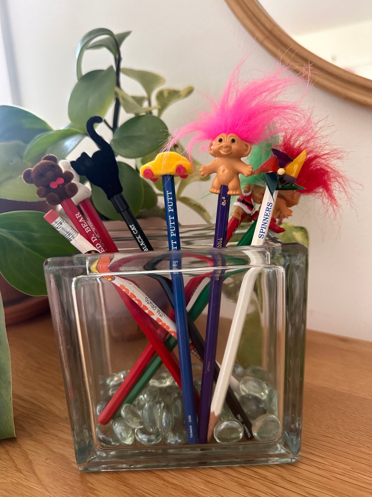 At school, the cool things for kids to collect and display were pencils with toppers- a little toy or charm at the top of the pencil. Kids kept their pencil collections on top of their desks held inside a clear, plastic, rectangular container. Most of my classmates went to this stationary store called “LMNOP” to buy their pencils and containers. A talented woman with a steady hand customized your container by writing your name on it with paint pens and adding Sandylion or Mrs.Grossman stickers of your choice. I loved seeing my name written on my container adorned with a Palm Tree sticker. I loved my pencils. Each one was a personal, special treasure.