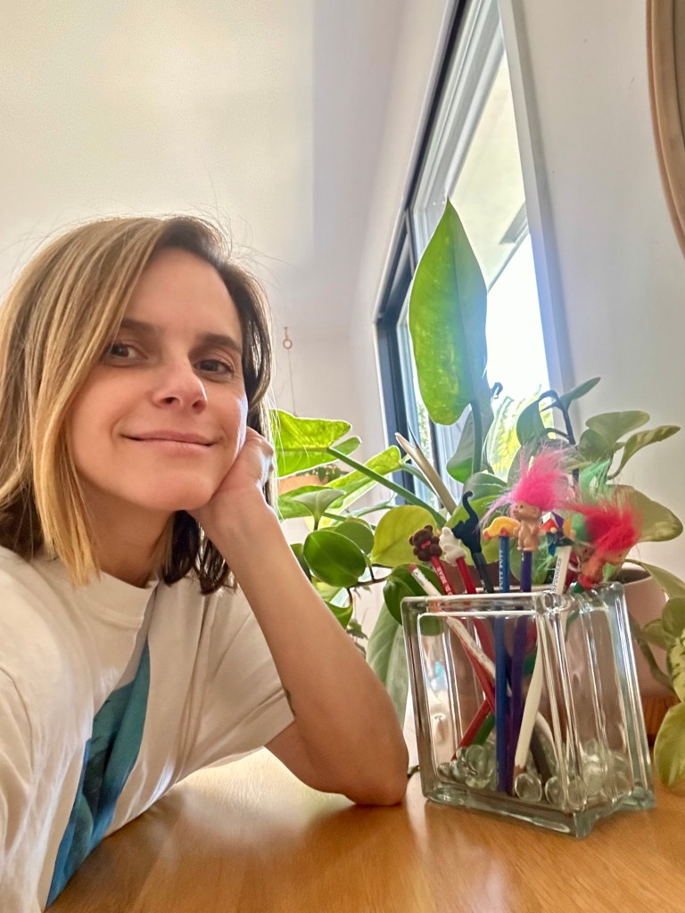 “As a child in the 1980s, I loved growing up in Orange County. There was the sunshine and beaches, Disneyland, and my favorite Mall -The South Coast Plaza. Everything was new, the homes, schools, roller skating rinks, movie theaters, shopping centers, and the man-made lakes. It was where my Mom, a stylish, blond, valley girl, drove her daughters around in a burgundy Datsun 280zx blasting Madonna and Heart. When it was just the three of us, we were happy, and that’s how I liked it. Also, the 80’s just slayed. One cool 80’s thing my mom had was a glass brick. It had a hole at the top. She put transparent glass pebbles at the bottom and stuck pens inside. She displayed it on the kitchen counter next to our cordless landline phone.