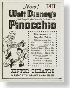 On February 7, 1940, The movie Pinocchio premiered at the Center Theater in New York City.