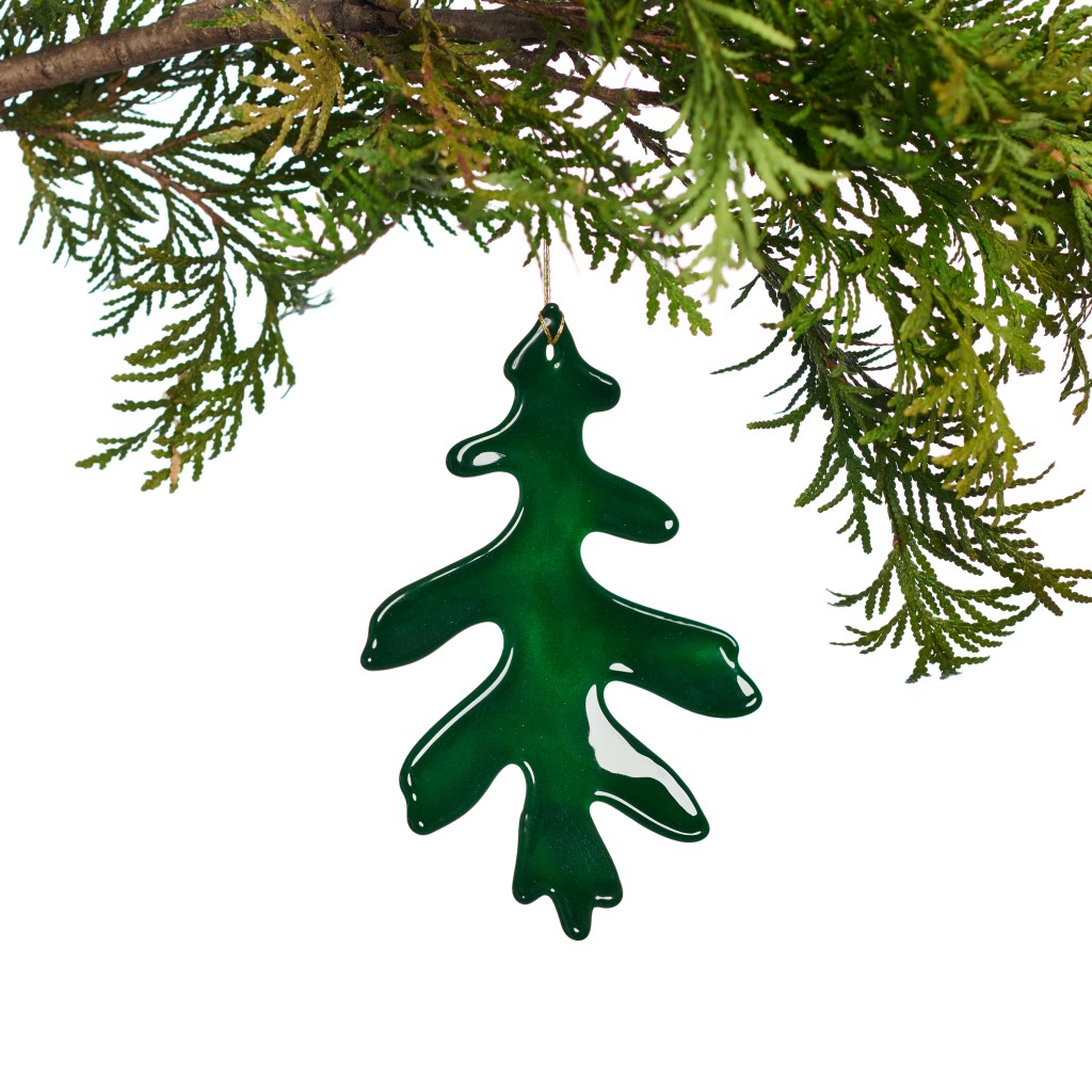The fused glass oak leaf ornament is perfect for holiday decor or given as a gift. Inspired by heirloom glass, Beetle Glass ornament collections are created to be part of a treasured holiday display year-after-year.
