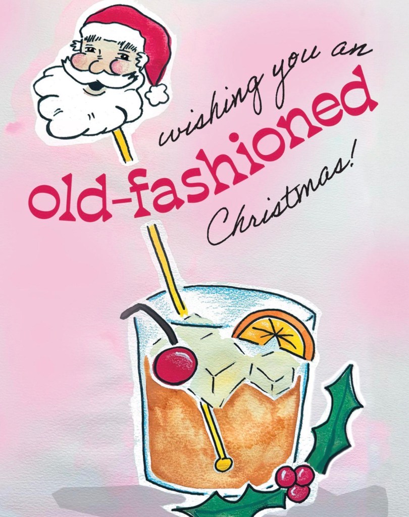 Old Fashioned Cocktail Christmas Card: Retro Santa, Watercolor Holiday
